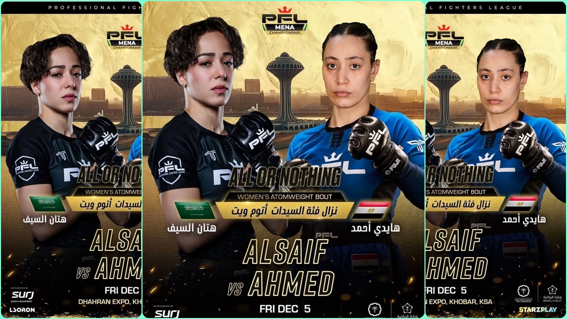 ذانيوز أونلاين// تتجه الأنظار إلى مدينة الخبر بالمملكة العربية السعودية، حيث تستضيف منافسات النزالات النهائية لبطولة دوري المقاتلين المحترفين لمنطقة الشرق الأوسط وشمال أفريقيا (PFL MENA)، والتي تشهد مشاركة بارزة للمقاتلة المصرية هايدي أحمد، بطلة مصر في الملاكمة ست مرات، التي تستعد لمواجهة المقاتلة السعودية هتان السيف في أول ظهور احترافي لها في الفنون القتالية المختلطة.