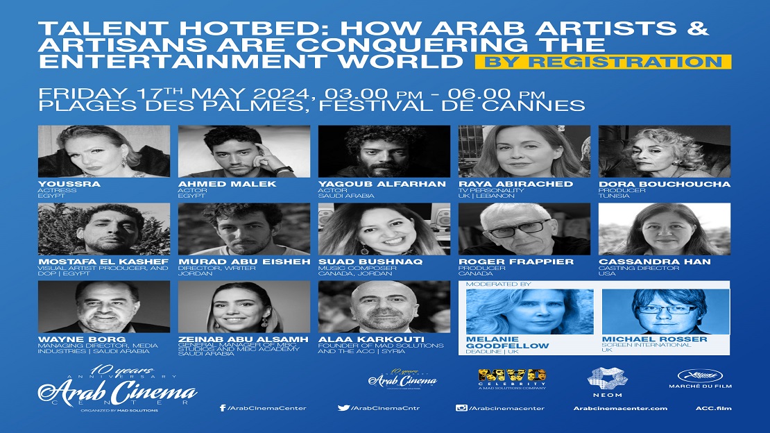ذانيوز أونلاين// ينظم مركز السينما العربية، بالتعاون مع وسوق الفيلم بمهرجان كان وMAD Celeberity عدد من حلقات النقاش والفعاليات المميزة التي ستعقد خلال الدورة السابعة والسبعين لمهرجان كان السينمائي الدولي والتي تستمر فعالياتها خلال الفترة من 14 إلى 25 مايو 2024.