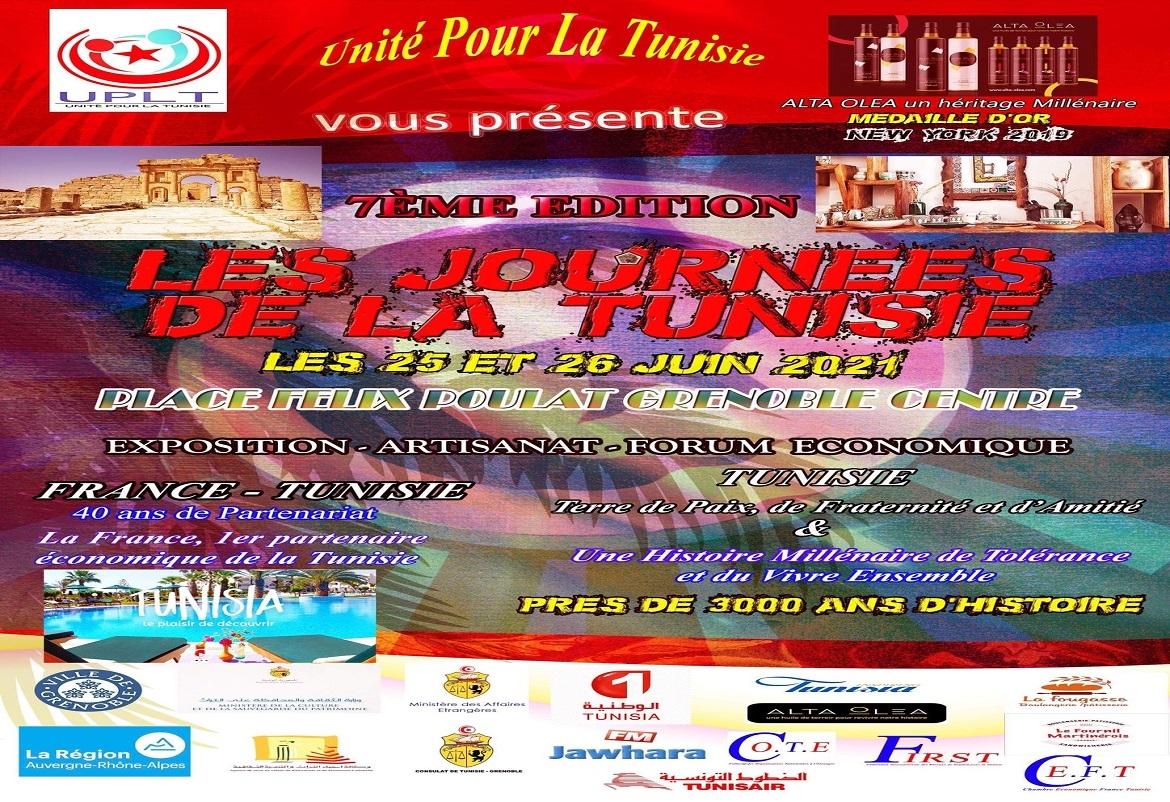 ذانيوز أونلاين// تنظم جمعية الوحدة من اجل تونس بمدينة غرونوبل بفرنسا الدورة السابعة للتظاهرة السياحية والاقتصادية والترويجية “ايام تونس بغرونوبل” وذلك يومي 25 و 26 جوان 2021.