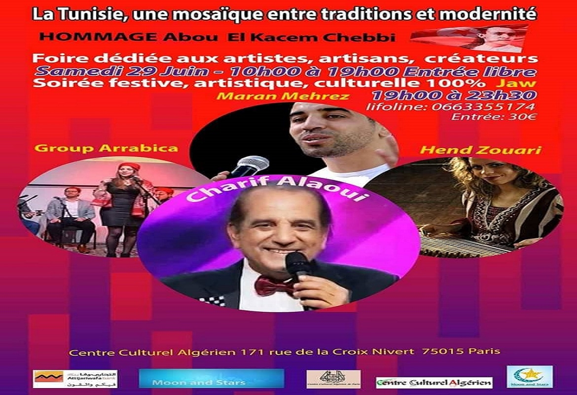 تنظم جمعية "القمر والنجوم " و مقرها باريس احتفالية كبرى تحت شعار "تونس فسيفاء بين التقاليد و الحداثة" وذلك بالمركز الثقافي الجزائري بباريس يوم 29 جوان 2019 .