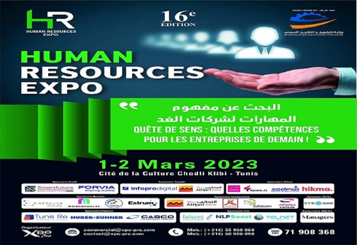 ذانيوز اونلاين// تحت شعار: ” البحث عن مَفْهُوم المهارات لشركات الغد " تنتظم الدورة السادسة عشرة للصالون الدولي للموارد البشرية وذلك يومي 1 و 2 مارس 2023 بمدينة الثقافة.