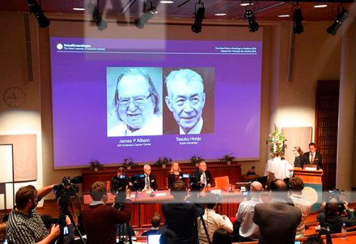 فاز الأميركي جيمس أليسون من جامعة تكساس، والياباني تاسوكو هونجو من جامعة كيوتو، بجائزة نوبل للطب للعام 2018، وذلك تقديرا لاكتشافهما طرقا جديدة لعلاج مرض السرطان، وسيحصل أليسون وهونجو على نحو مليون دول...