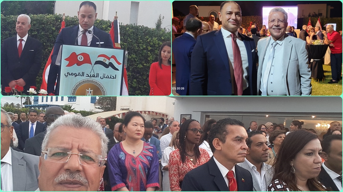 ذانيوز أونلاين// العيد القومي لجمهورية مصر العربية والذى يصادف الذكرى ال 73 لثورة يوليو المجيدة واحتفالية بالمناسبة أقامها السفير المصري باسم حسن، بمقر الإقامة ب تونس.