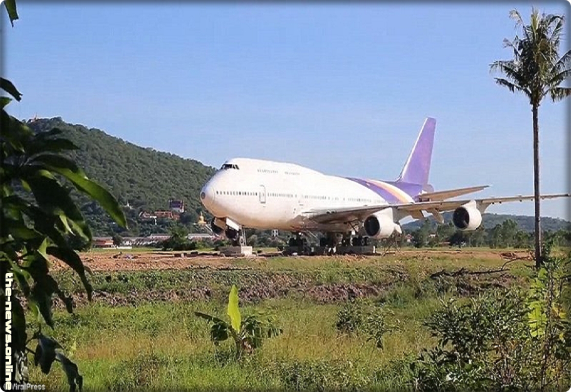 في إحدى القرى بمحافظة تشاي نات شمالي تايلند، الأهالي تجمعوا لمشاهدة طائرة عملاقة تحمل الشعار الأرجواني والذهبي للخطوط الجوية الدولية التايلندية.