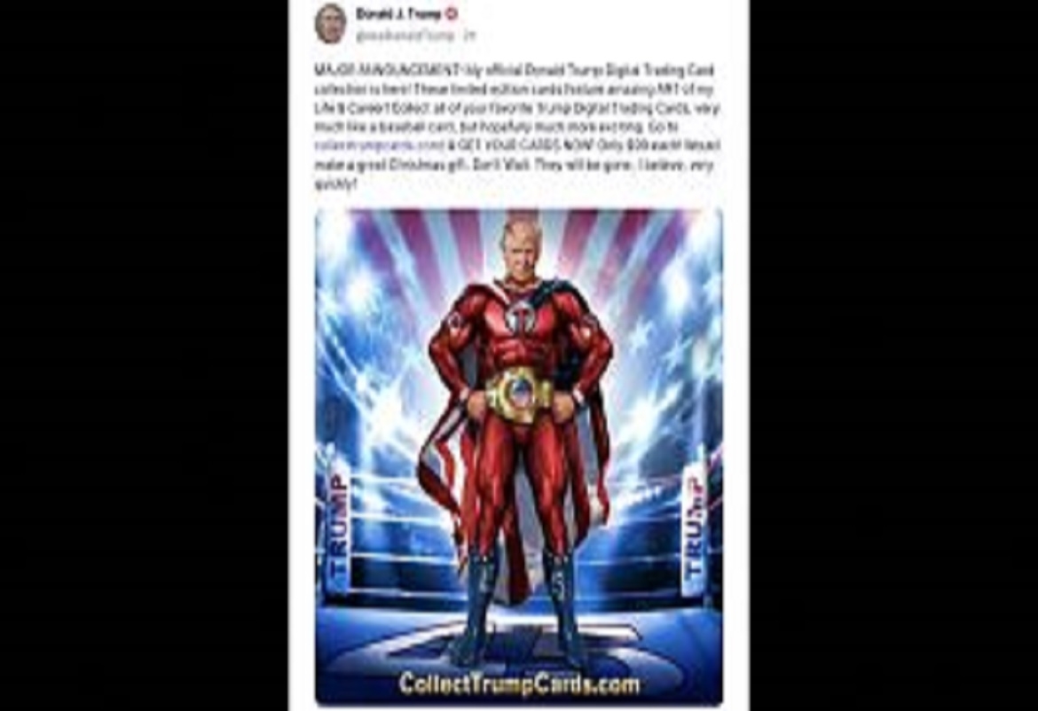 ذانيوز أونلاين//بعد أيام من كشفه عن استعداده لـ "إعلان مهم" قريباً ، أعلن الرئيس الأمريكي السابق دونالد ترامب إطلاق مجموعة من بطاقات التداول الرقمية بنظام الرموز غير القابلة للاستبدال، تصوره بأزياء وأشكال مختلفة، فتارة يظهر كبطل خارق وتارة كرائد فضاء أو سائق سيارة ناسكار Nascar (سيارة من سيارات الاتحاد القومي لسباقات السيارات القياسية).