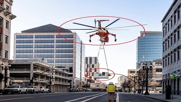 ذانيوز اونلاين:- وقع حادث في شارع وسط مدينة أوكلاند الأمريكية تسببت فيه طائرة مروحية كانت تحمل جهاز تكييف ضخم بواسطة أسلاك مما أثار الهلع وسط الشارع.