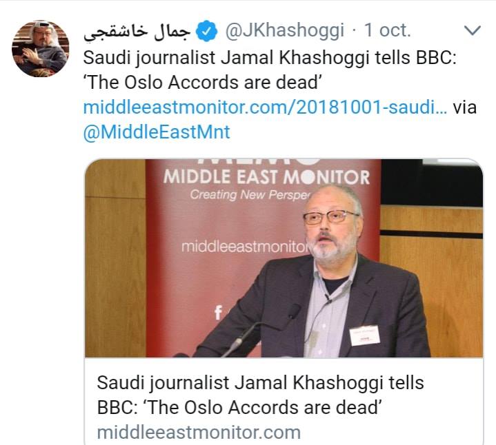 ان ما تم تناقله حول سبب ذهاب الخاشقجي إلى القنصلية السعودية بإسطنبول بحسب ما ذكرت "خطيبته" -نفى أقاربه علمهم بمعرفتها- هو استخراج وثائق تخص زواجهما المرتقب ... هنا يأتي السؤال لماذا لم يستخرج الوثائق من مكان إقامته او من المكان الذي تواجد به "لندن" حيث شارك ب ندوة يوم 1 أكتوبر حول " 25 عاماً على اتفاق أوسلو، والتي قال خلالها :" لقد مات اتفاق أوسلو.. . " و " من يبني المستوطنات و يُدمِر البيوت لا يريد سلاماً" هذه كانت آخر كلماته ![]()