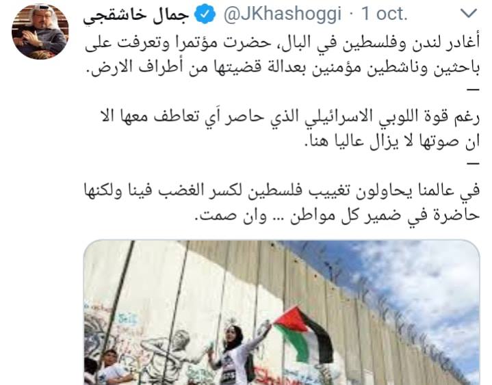 إضافة إلى آخر تغريده نشرها يوم 1 اكتوبر عل حسابه ب تويتر ،قبل اختفاءه " أغادر لندن وفلسطين في البال، حضرت مؤتمرا وتعرفت على باحثين وناشطين مؤمنين بعدالة قضيتها من أطراف الارض.