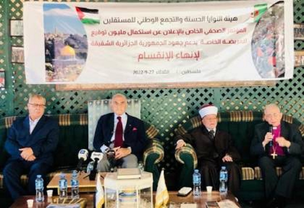 ذانيوز أونلاين// أعلن رئيس هيئة النوايا الحسنة السيد منيب رشيد المصري عن استكمال مليون توقيع للعريضة الخاصة بدعم جهود الجمهورية الجزائرية الشقيقة لإنهاء الانقسام، وجرى الإعلان خلال المؤتمر الصحفي الذي عقد اليوم الثلاثاء في مقر منتدى فلسطين بتنظيم من هيئة النوايا الحسنة والتجمع الوطني للمستقلين، في رام الله.