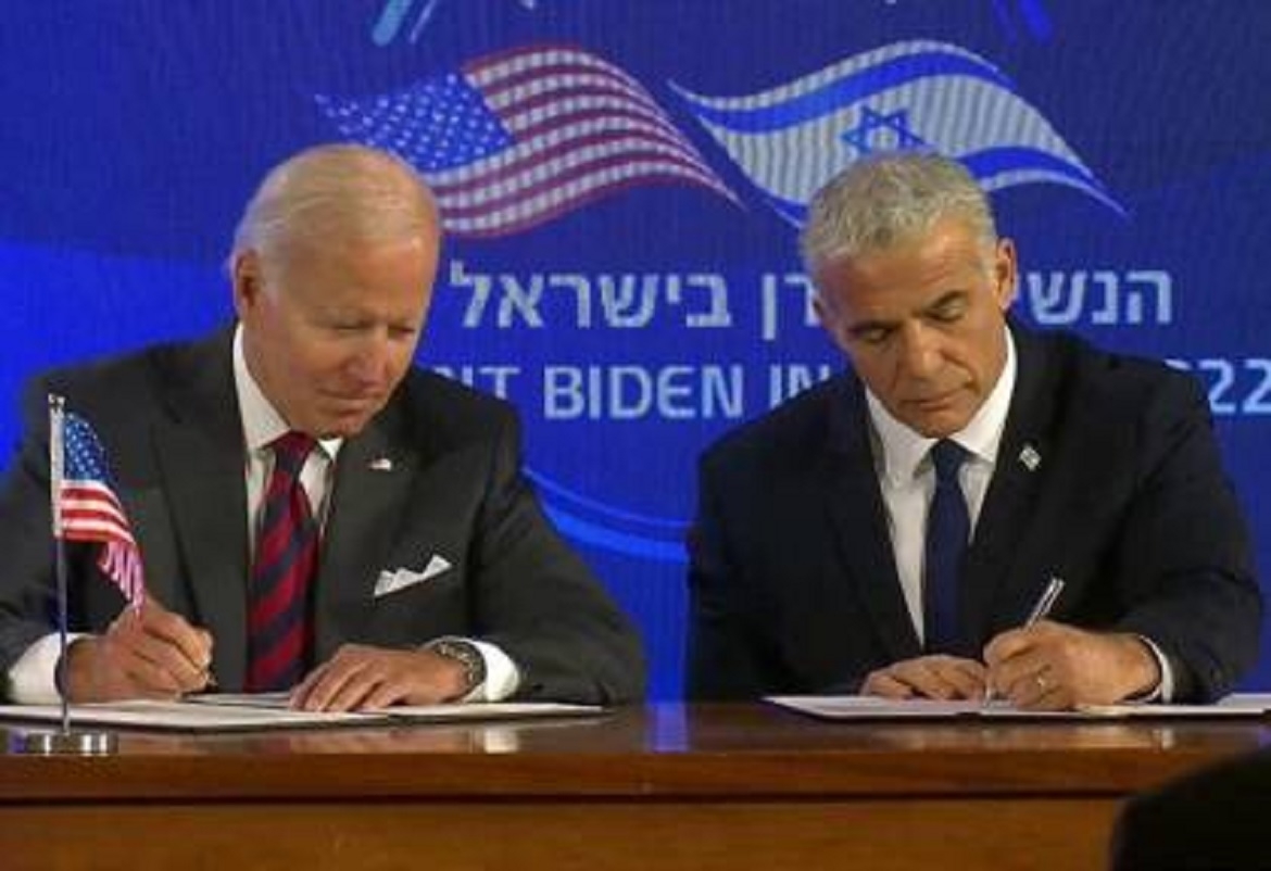 ذانيوز اونلاين// وقع الرئيس الأميركي، جو بايدن، ورئيس الحكومة الإسرائيلية، يائير لبيد، خلال مؤتمر صحافي في فندق وولدورف أستوريا في القدس اليوم، الخميس، على وثيقة مشتركة حول العلاقات بين الجانبين، يطلق عليها تسمية "إعلان القدس".