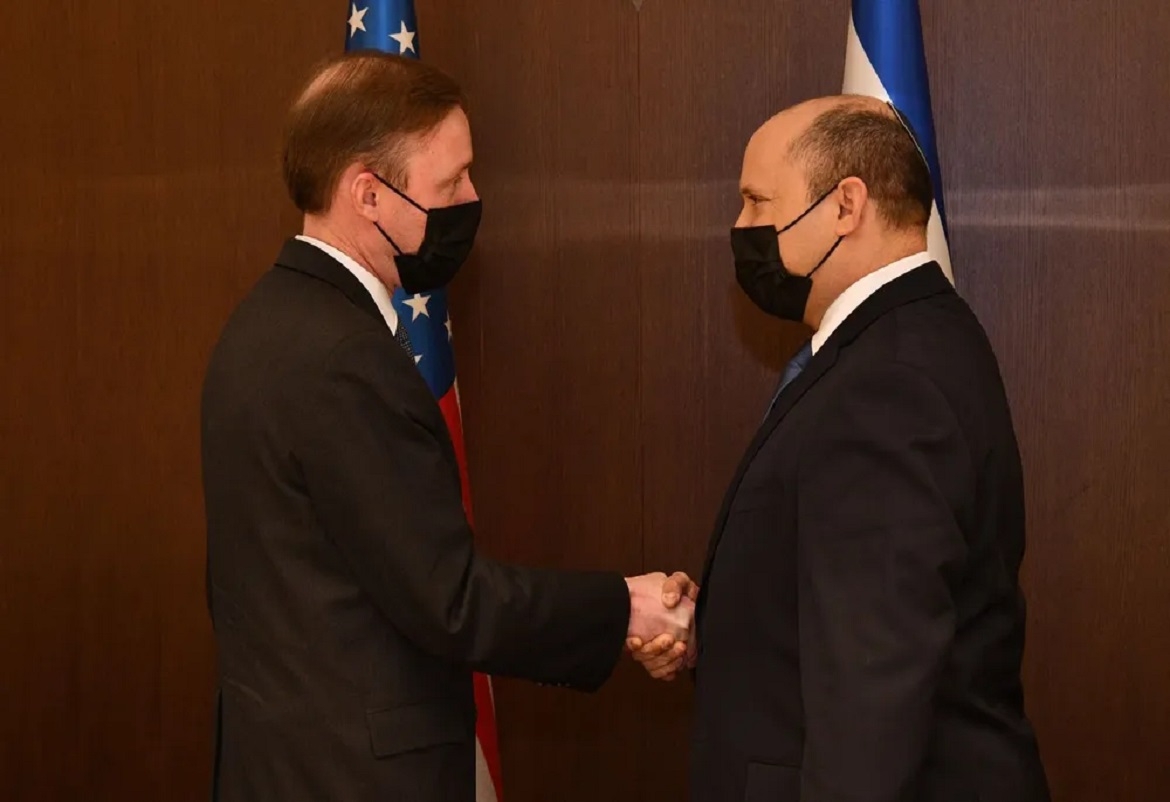 ذانيوز أونلاين// اجتمع رئيس الحكومة الاسرائيلية نفتالي بينيت اليوم مع مستشار الامن القومي الامريكي جايك سوليفان في مكتبه بمدينة القدس، وناقش الجانبان خلال الاجتماع المباحثات حول النووي الايراني المنعقدة في فيينا، مؤكدين ان هذه نقطة زمنية حاسمة لكلا البلدين.