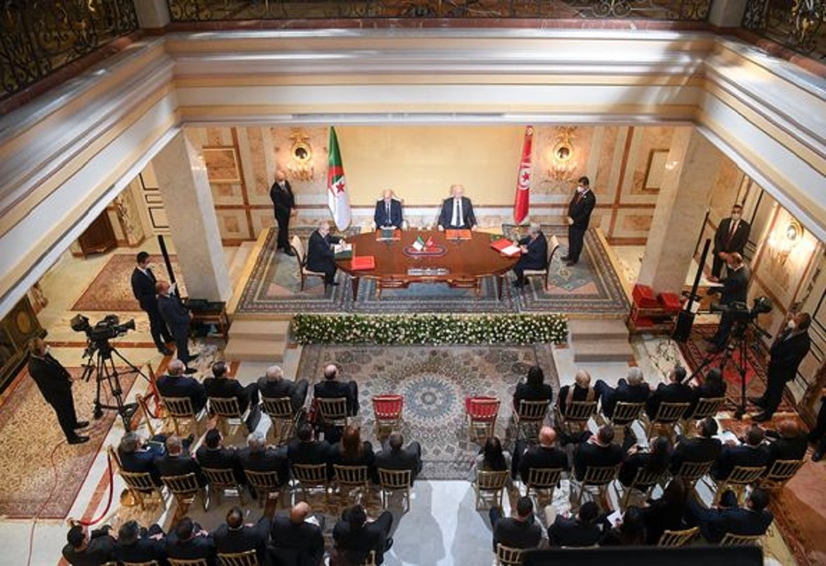 ذانيوز اونلاين// أشرف رئيس الجمهورية قيس سعيد، مساء اليوم الأربعاء 15 ديسمبر 2021 بقصر قرطاج، بمعية فخامة الرئيس عبد المجيد تبون، رئيس الجمهورية الجزائرية الديمقراطية الشعبية الشقيقة، على مراسم توقيع 27 اتفاقية ومذكرة تفاهم بين البلدين شملت مجالات العدل والمؤسسات العمومية والداخلية والتعاون اللامركزي والاتصال والإعلام والصناعة والمؤسسات الصغرى والمتوسطة والبيئة والتجارة الخارجية والثقافة والشؤون الدينية والطاقة والتكوين المهني والصيد البحري والتشغيل والمرأة والطفولة والمسنين والشباب والرياضة والتربية والصحة.