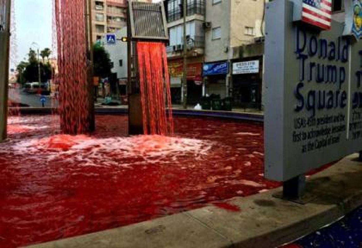 ذانيوز اونلاين// أقدم مجهولون يعتقد أنهم من نشطاء اليسار الإسرائيلي، على طلاء ساحة عامة في منطقة بتاح تكفا، أُطلق عليها قبل عام اسم الرئيس الأميركي دونالد ترامب، باللون الأحمر، وسكبه في مياه النافورة الخاصة بالساحة.