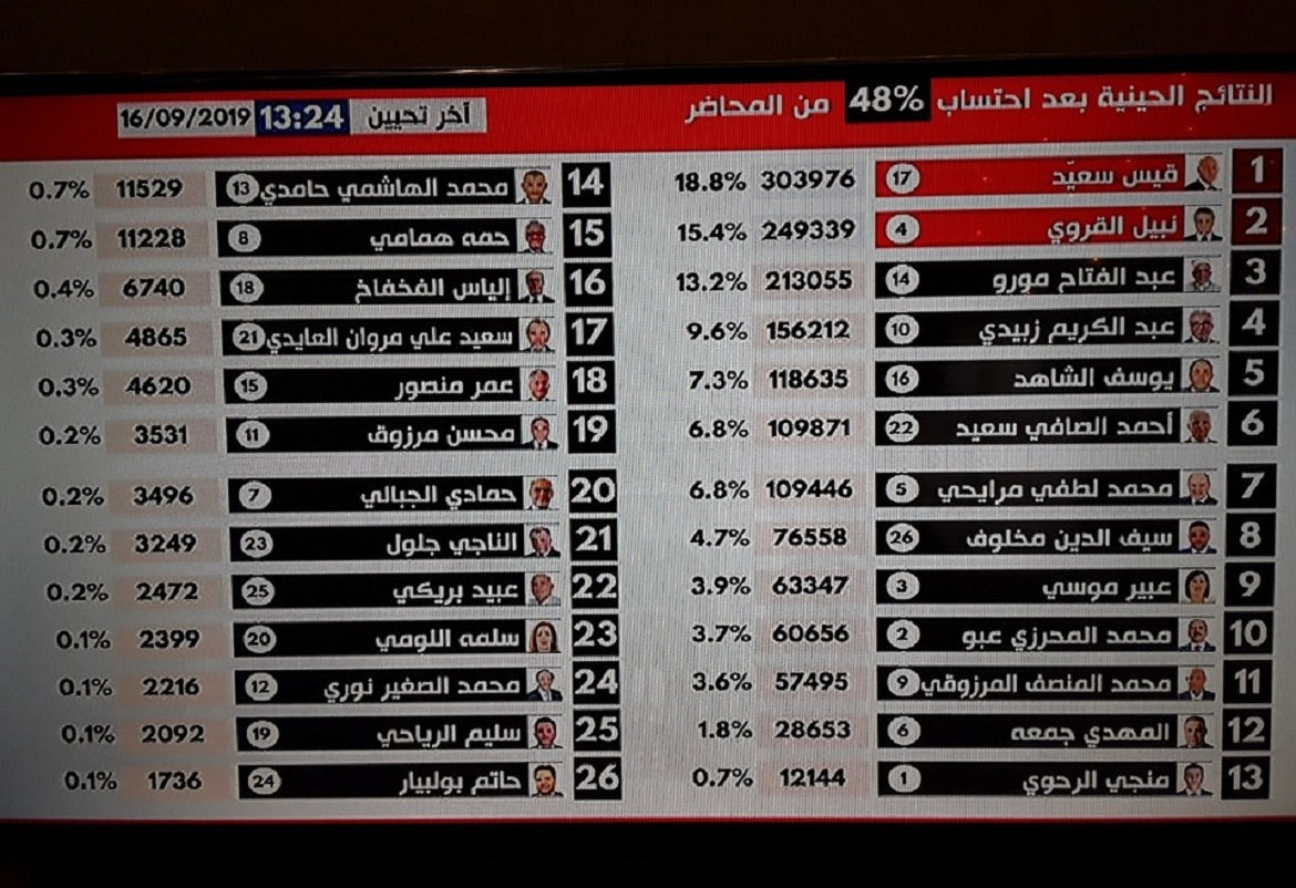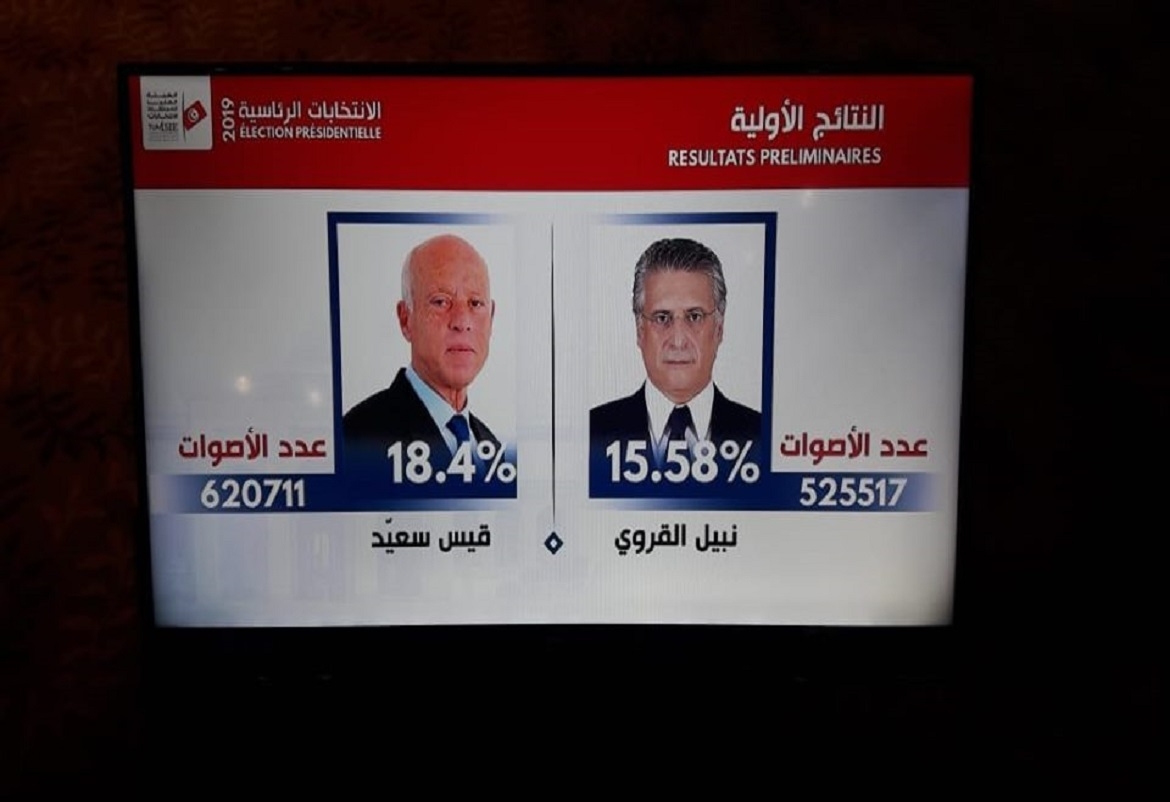 أعلن رئيس الهيئة العليا المستقلة للإنتخابات ب تونس نبيل بفون، خلال ندوة صحفية ان نتائج الدورة الأولى للإنتخابات الرئاسية قد أظهرت تقدم إثنين من المُترشِحين ال 26 إلى هذه الإنتخابات وهما المترشح المستقل أستاذ القانون الدستوري قيس سعيّد بنسبة 18.4 % والمترشح رجل الأعمال التونسي نبيل القروي، مالك قناة نسمة التليفزيونية ورئيس حزب قلب تونس والموقوف فى السجن على ذمة قضايا تهرب ضريبي ، بنسبة 15.6 % .